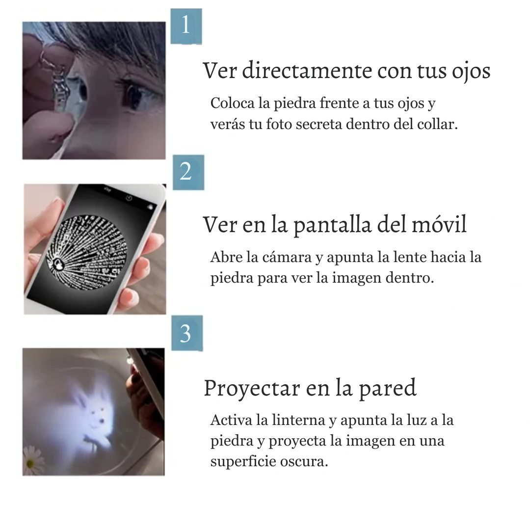 2. Mirando directamente: acerca el collar a tu ojo y podrás ver la imagen dentro del cristal.