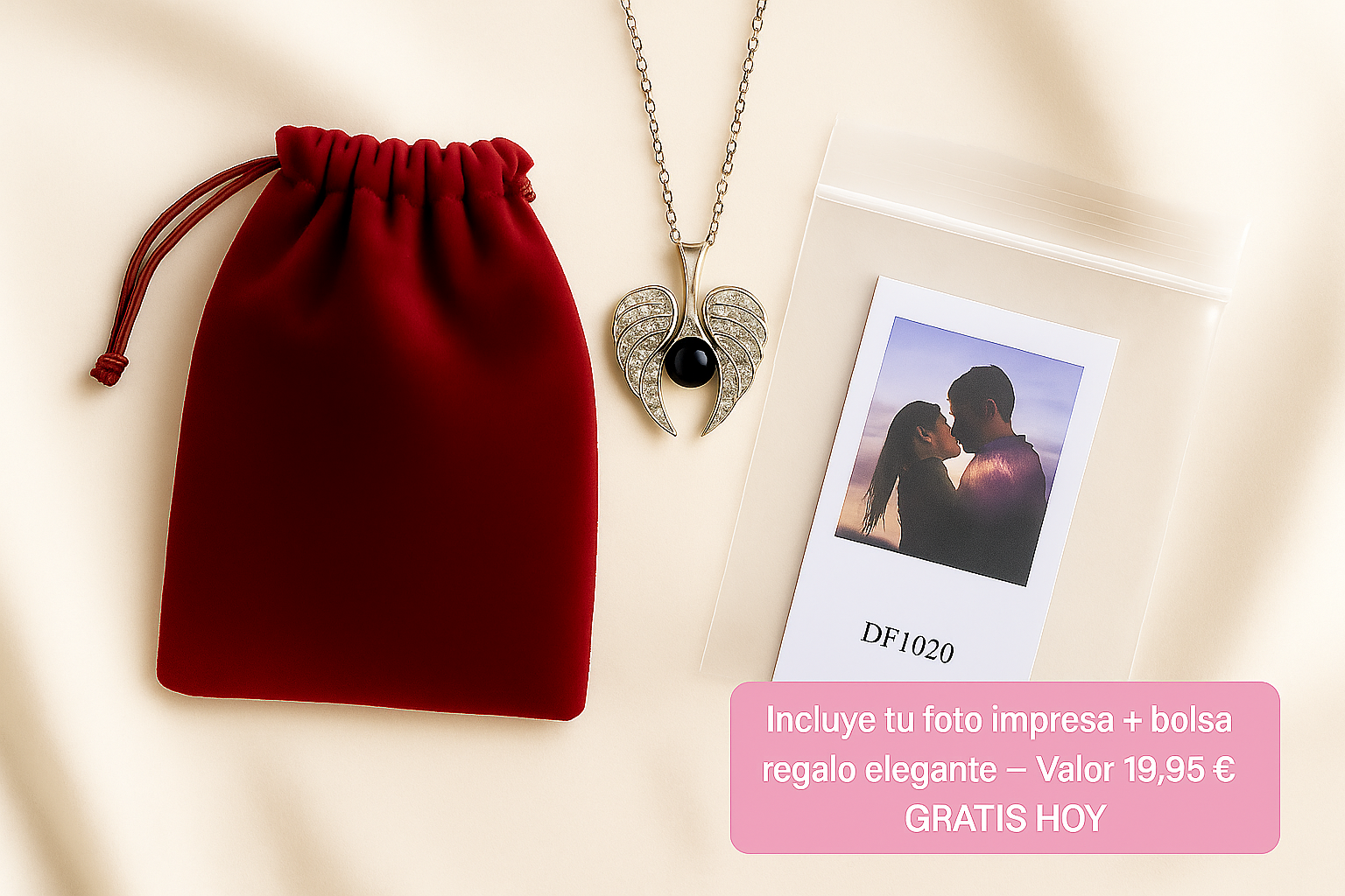 Es un collar con alas en forma de corazón que contiene una microproyección personalizada: dentro lleva tu foto (o la de alguien especial), visible al mirar a través del centro o proyectando luz sobre una superficie.